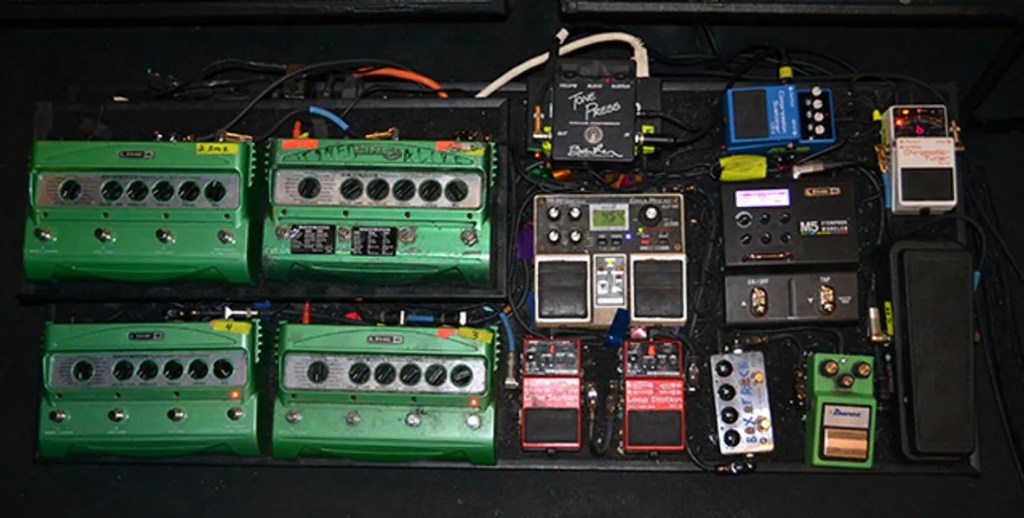 No song exemplifies this feeling more than Pachuca Sunrise from 2005s Menos El Oso. The opening riff immediately captures your attention carried on the waves of choral synths. Knudson is triggering live samples on his DL4. As he tap dances on his pedal board triggering loops as he accompanies himself, fretting neck-spanning chord structures (all in standard tuning). Snider’s opening lyric “Midnight on a beach in the mediterranean…” solidifies our setting in the shifting space of land and sea, between night and morning. Snider sings about a love that he’s lost, presumably a breakup.